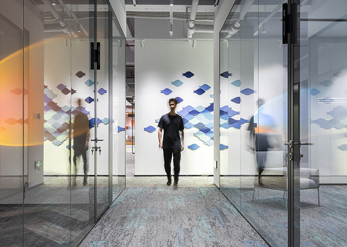 ग्लास विभाजनों में, दृश्यता को ग्लास पैनलों के बीच फ्रिज या रंगीन ग्लास का उपयोग करके या अंधाओं को एकीकृत करके नियंत्रित किया जा सकता है।